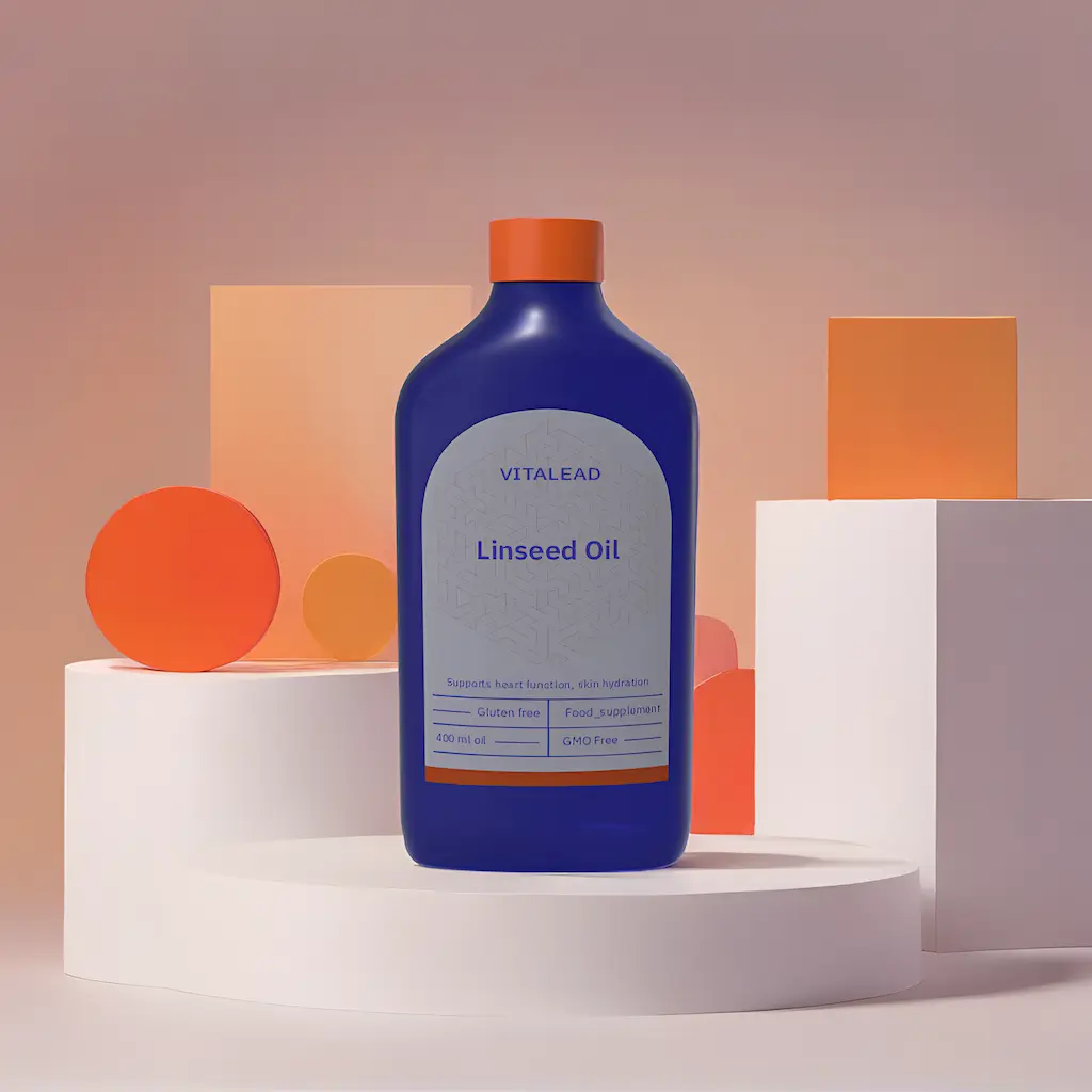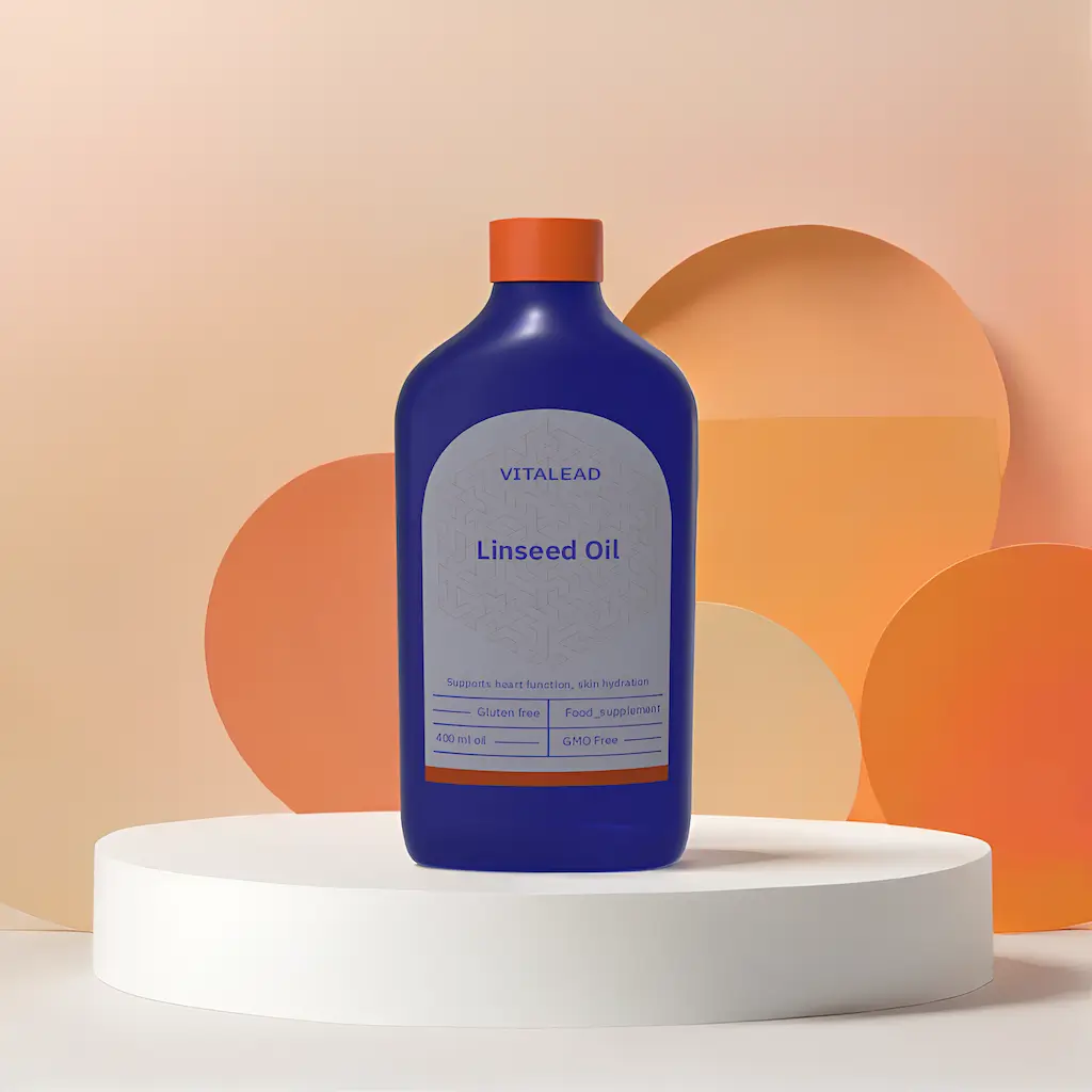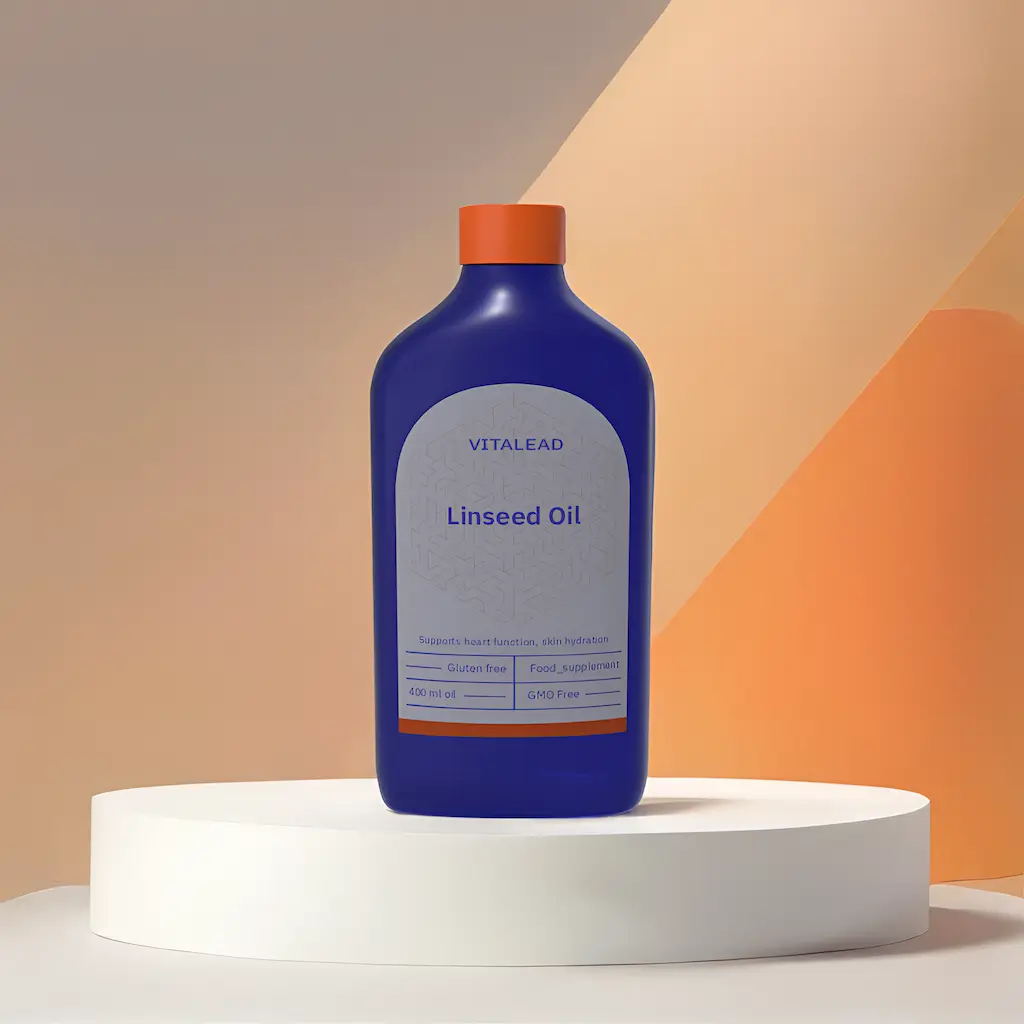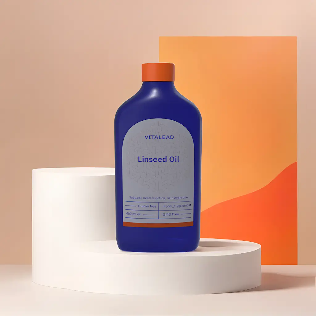 Vitalead Organic Linseed Oil – a cold-pressed oil rich in alpha-linolenic acid (ALA) omega-3s, supporting heart health, skin vitality, and inflammation balance.