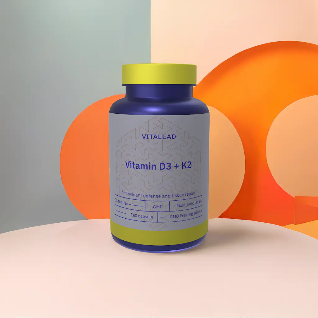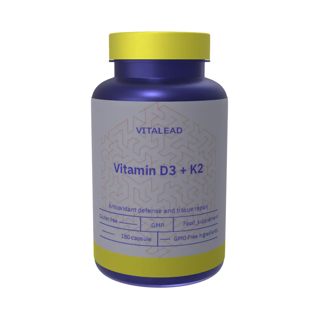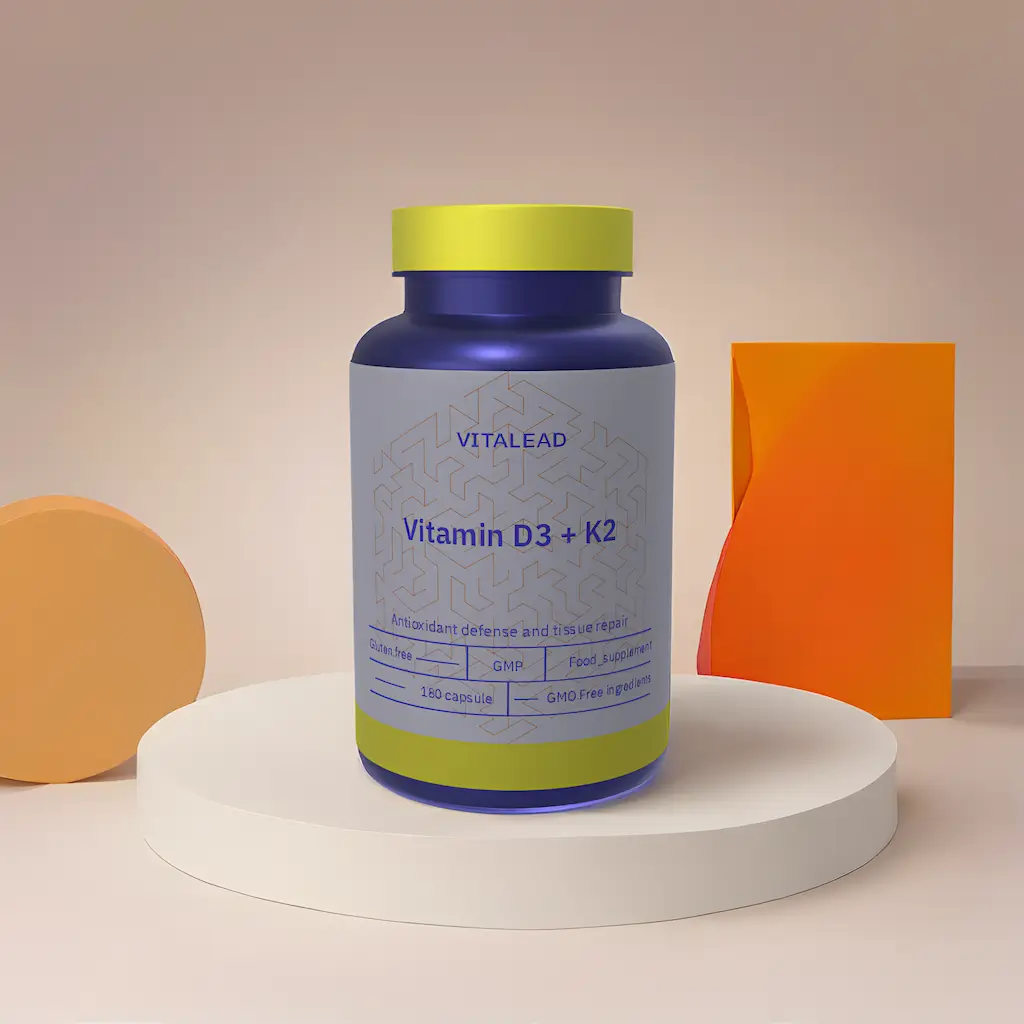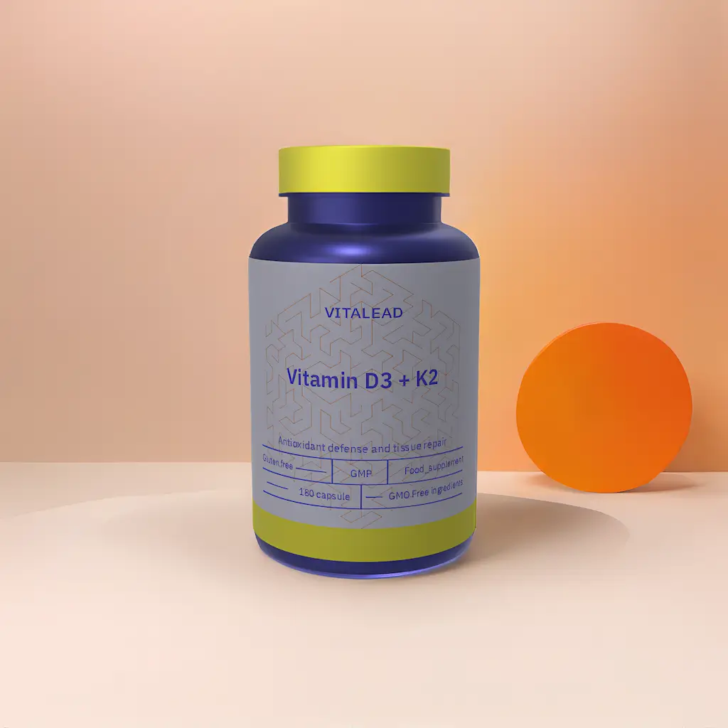 Vitalead Vitamin D3 + K2 combines two vital nutrients for optimal calcium metabolism and cardiovascular protection. Vitamin D3 enhances calcium absorption, while K2 directs it into bones, preventing arterial calcification. This synergy supports bone density, joint mobility, and long-term heart health.